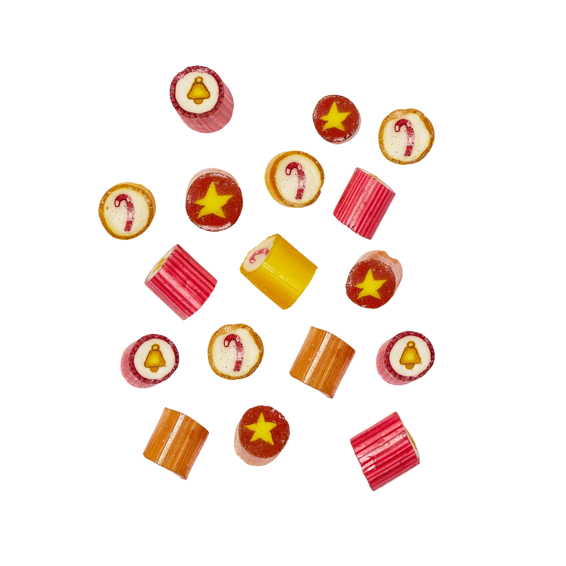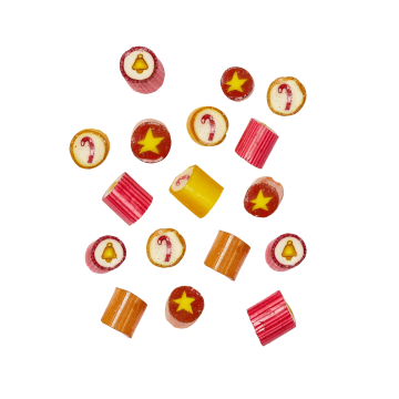Cukierki Mix Świąteczny o smakach: żurawina (gwiazdka), wiśnia (dzwonek), pomarańcza (laseczka)