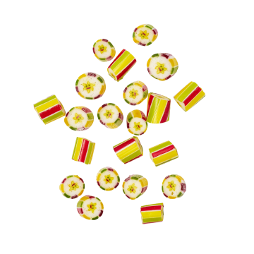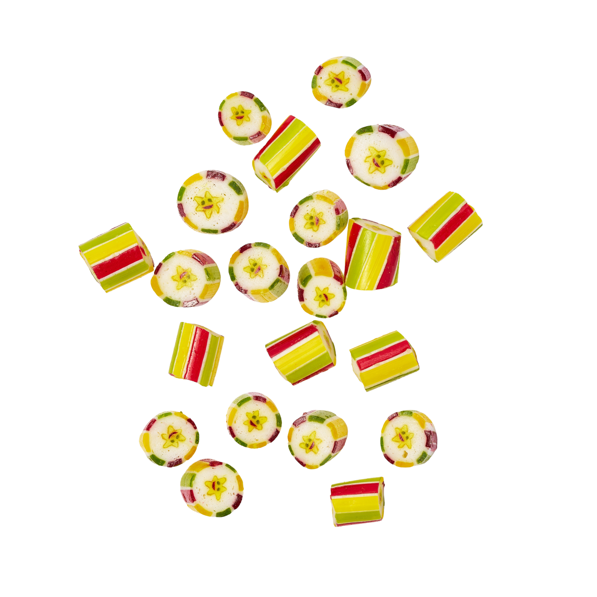 SKŁADNIKI: ksylitol fiński (substancja słodząca pochodzenia roślinnego), izomalt, kwas cytrynowy, naturalny aromat, BARWNIKI NATURALNE: chlorofilin (zielony), betanina (różowy), kurkumina (żółty), annato (pomarańczowy).