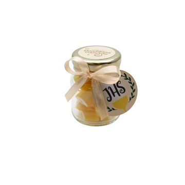 Słoik z okazjonalną naklejką i wstążką.
