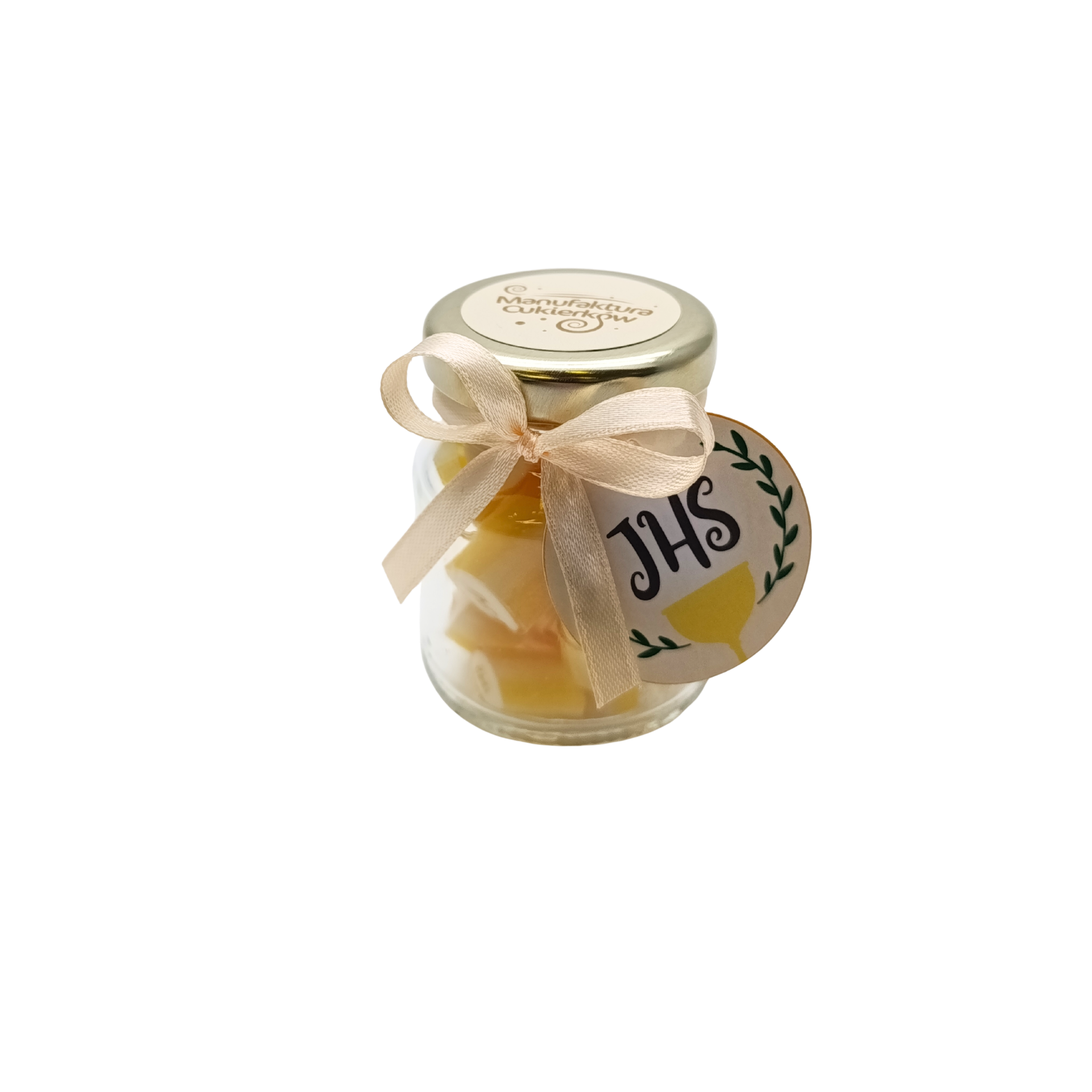 Cukierki z napisem IHS o smaku wieloowocowym stworzone z owoców: malina, mango, marakuja, melon, morela.