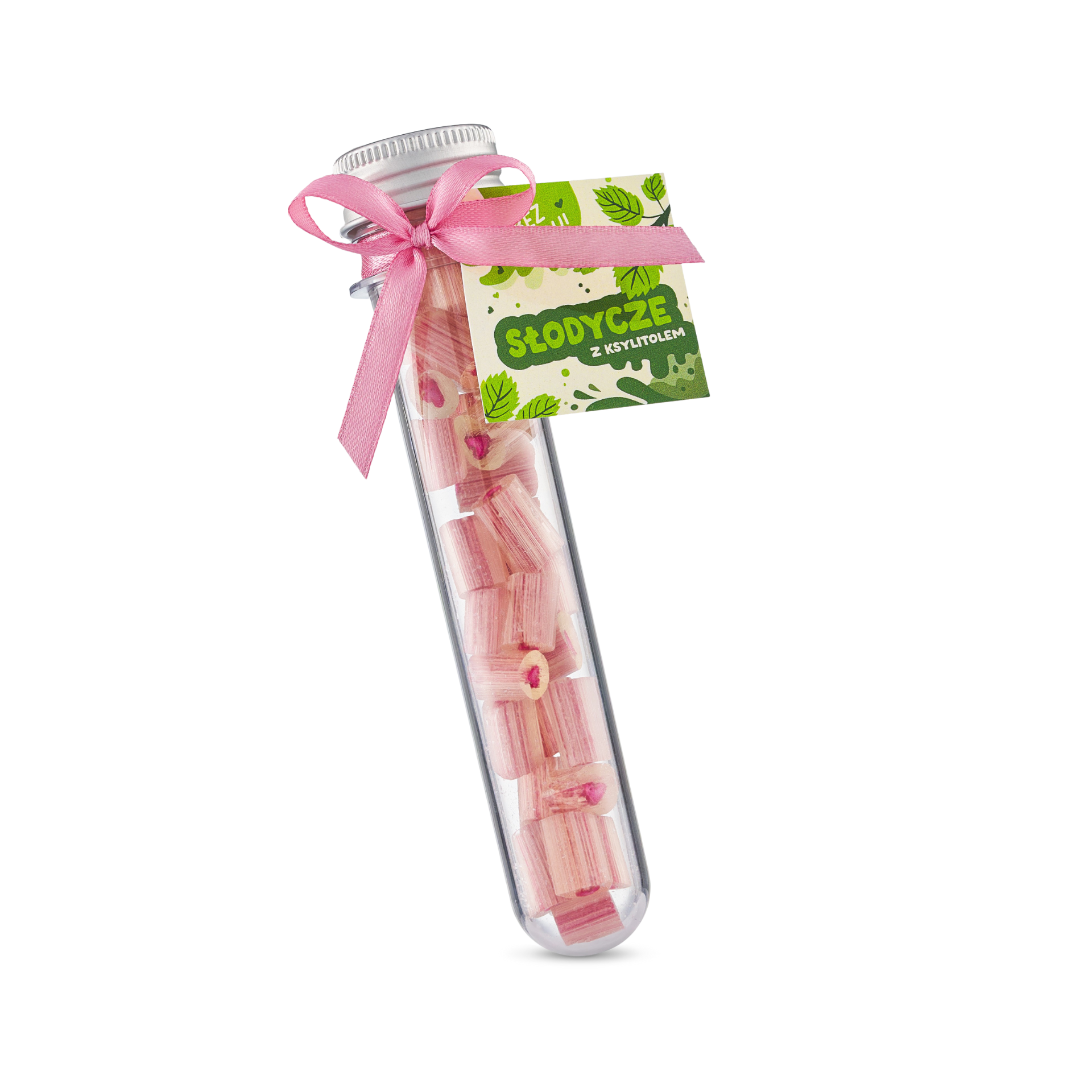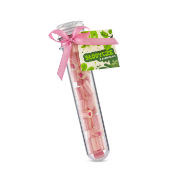 Cukierki o smaku shake truskawkowy w fiolce z okazjonalną etykietą.
